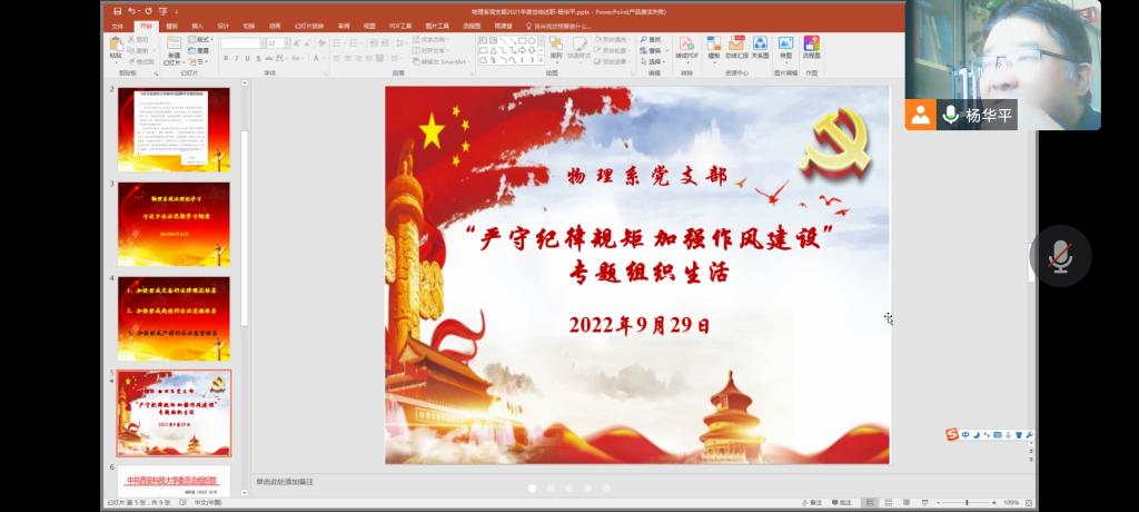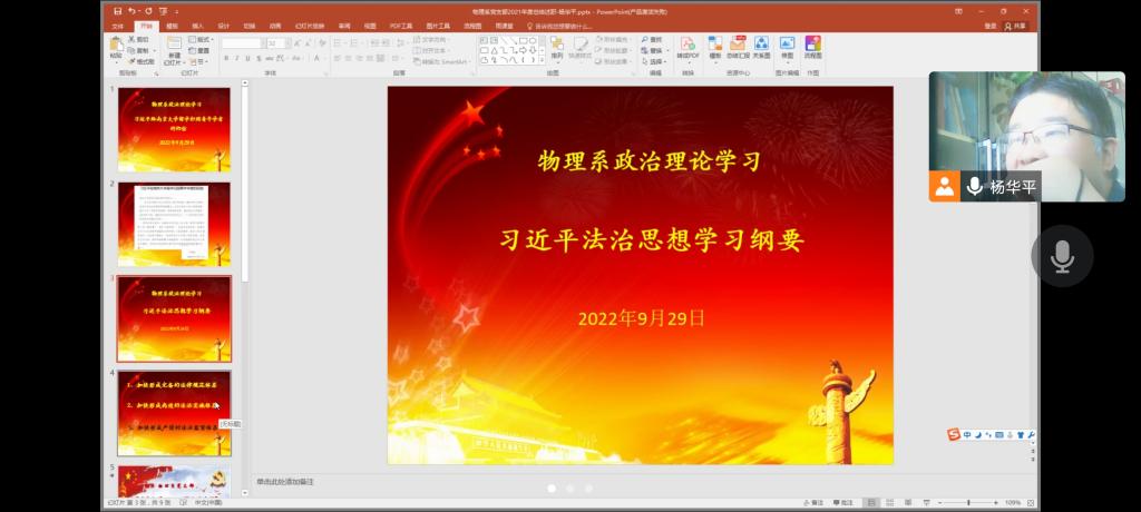 9月29日上午,威廉体育官方网站物理系党支部以腾讯会议平台召开“严守纪律规矩,加强作风建设”专题组织生活会。会上,大家集中学习了《习近平谈治国理政》第四卷、《习近平法治思想学习纲要》等。支部书记杨华平首先代表支部向所有党员通报了支部查摆问题的情况,指出了存在的问题和差距,并提出相关整改措施。之后,每位党员结合各自的政治理论学习和工作实际逐一进行自我评价,开展批评与自我批评,并对支部作风建设提出意见和建议,会议气氛热烈。