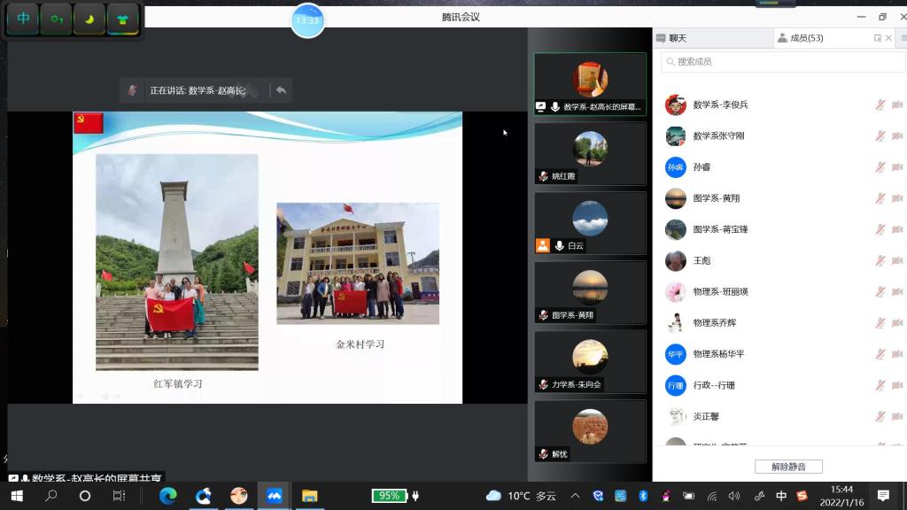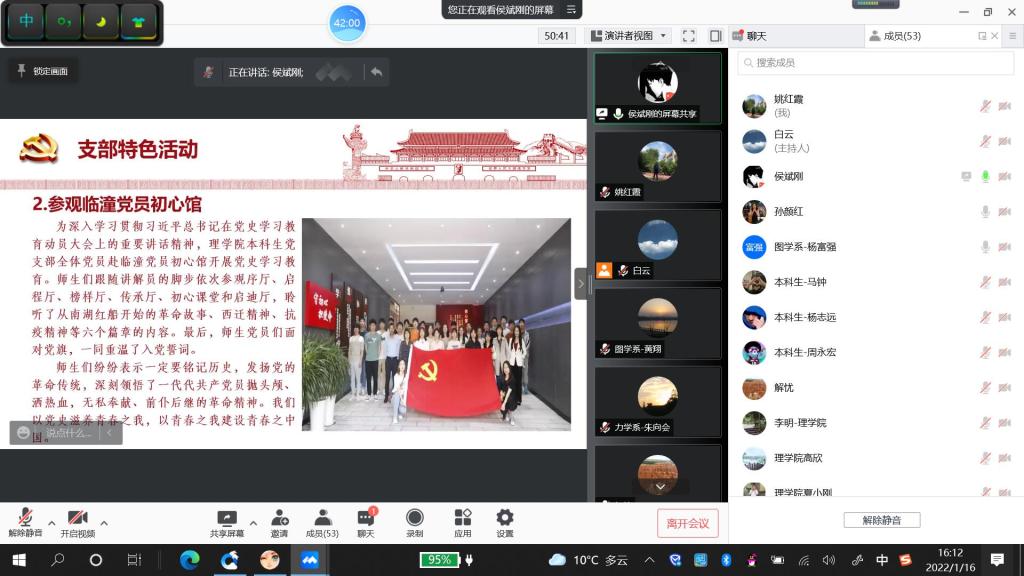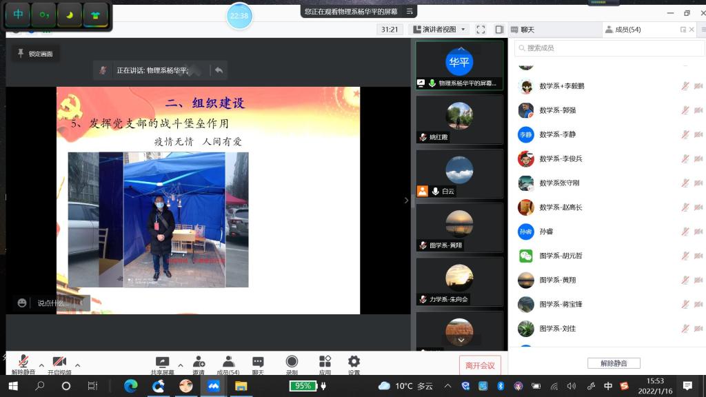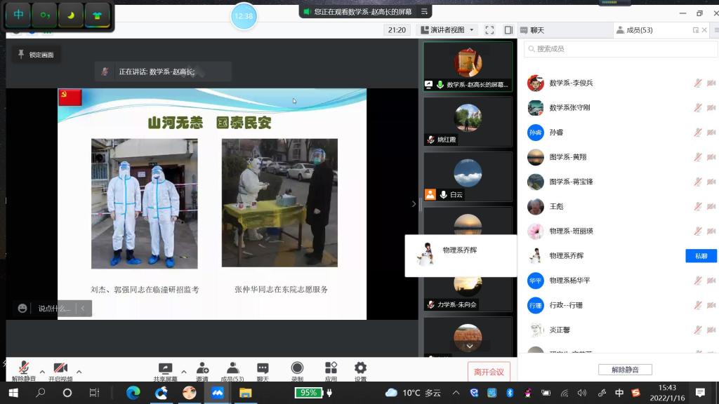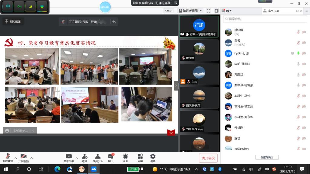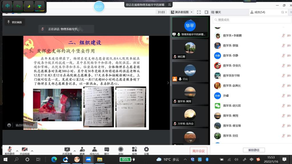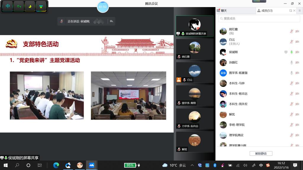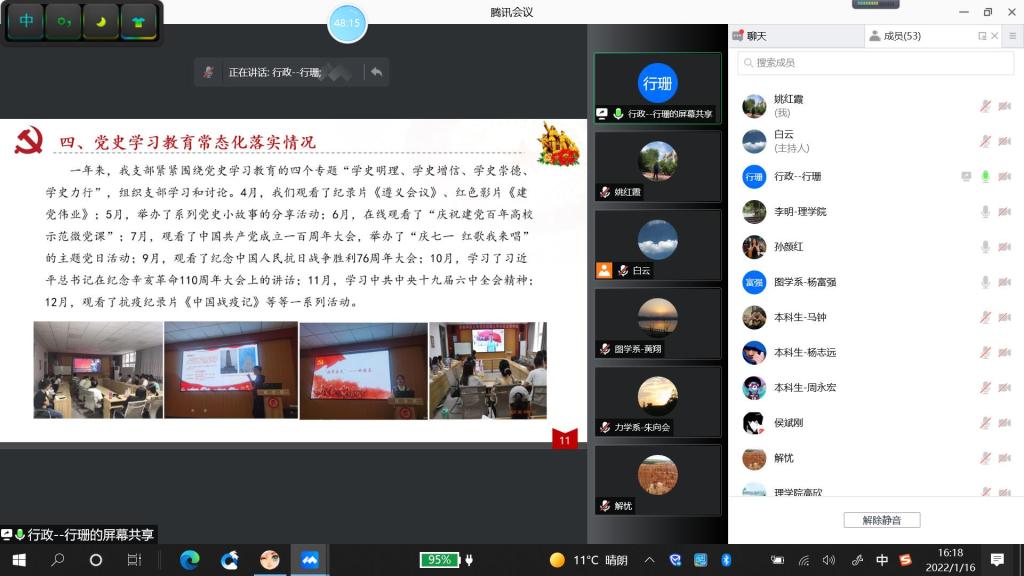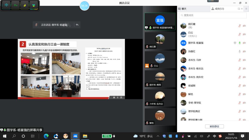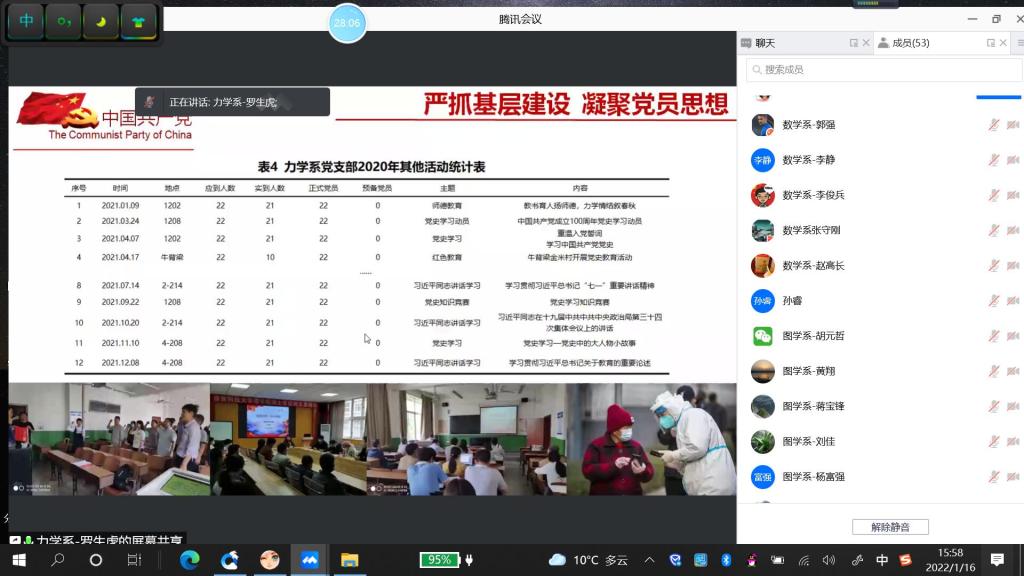 2022年1月16日下午,威廉体育官方网站以腾讯会议平台召开了2021年度党支部书记抓党建述职评议考核会议。威廉体育官方网站全体班子成员、党委委员、党支部书记及支委、系主任及党内外代表共53人参加会议。