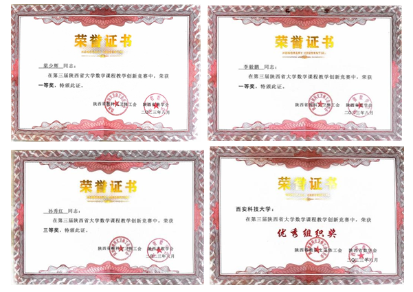 近日,在榆林公司举办的“第四届陕西高校大学数学课程建设与教学改革研讨会”公布了第三届陕西省大学数学课程教学创新竞赛的比赛结果,公司教师获得佳绩,其中梁少辉、李毅鹏两位老师获得一等奖,孙秀红老师获得三等奖,威廉体育官方网站荣获优秀组织奖。