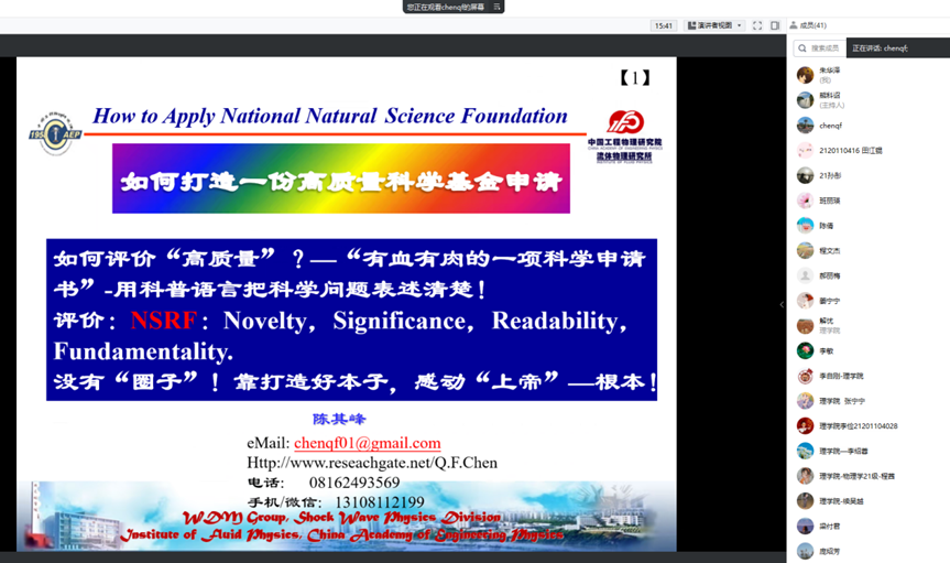 会上,陈其峰教授结合自己在国家自然科学基金申报过程中的经历和经验,作了“如何打造一份高质量科学基金申请书”的精彩报告。陈教授从如何打造一份有血有肉的高质量科学申请书入手,通过物理类案例讲解了如何提出问题、解决问题、凝练科学问题等一系列重要环节。报告深入浅出,对教师们在现阶段如何选定科学问题属性和申请代码等关键细节带来了很大启发。报告结束后,威廉体育官方网站部分老师汇报了基金的进展情况,陈其峰教授就具体问题提出了建设性指导。