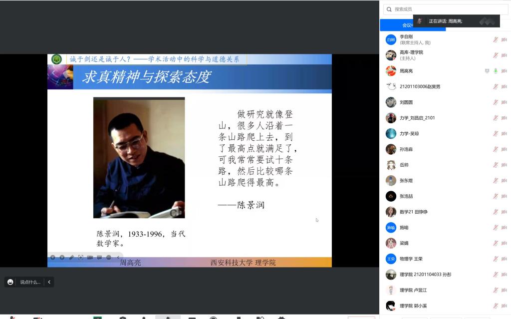 12月17-18日,威廉体育官方网站在线举办了科学道德和学风建设系列讲座,报告会由威廉体育官方网站副经理李自刚主持,力学系青年教师刘小宇博士和物理系教师周高亮博士分别就科研工作中的科学道德和学风建设问题做了精彩报告,威廉体育官方网站研究生及部分教师参加了报告会。