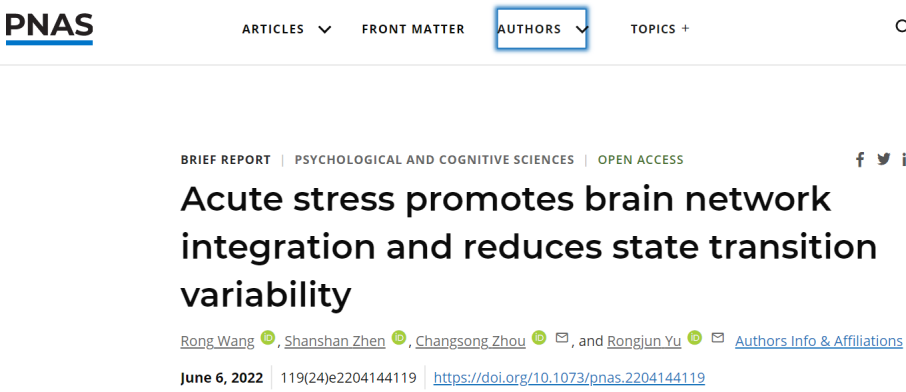 近日,威廉体育官方网站王荣副教授课题组与香港浸会大学周昌松教授、余荣军教授,在社交压力形成机理研究方面取得突破性研究进展,研究成果以“Acute stress promotes brain network integration and reduces state transition variability”为题在美国科公司院刊PNAS,以report形式在线发表,威廉体育官方网站为第一单位。