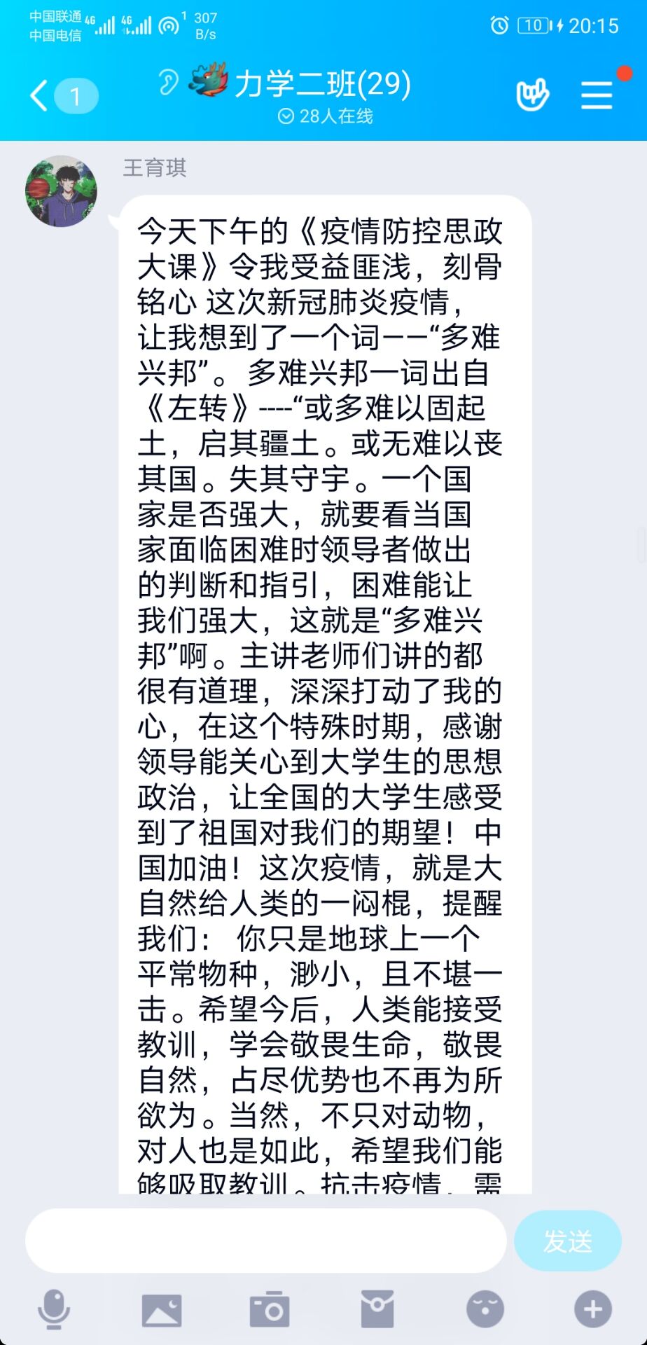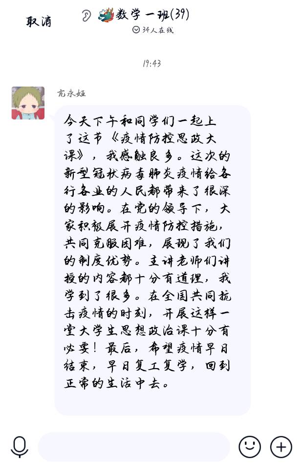 3月9日下午,威廉体育官方网站组织全体员工观看了“全国老员工同上一堂疫情防控思政大课”。威廉体育官方网站全体研究生和本科生15个班共479人认真观看了这堂课,并在各自班级群里进行线上讨论,每个同学都撰写了观后感,反响热烈。同学们纷纷表示,在以习近平同志为核心的党中央的坚强领导下,在全国各族人民共同的努力下,我们一定能取得抗击疫情的全面胜利。
