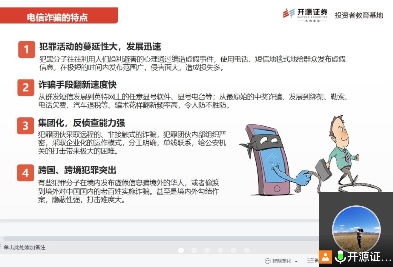 讲座从老员工的消费生活谈起,讲解了“电信(网络)诈骗”和“非法校园贷”的危害及预防方法,进行了全国投资者保护宣传日和“打击和防范经济犯罪宣传"活动的宣传,还介绍了证券从业考试的现状和金融业的就业前景。她强调了老员工理性消费、防范风险的重要性,讲解结合实例,生动形象,发人深省。