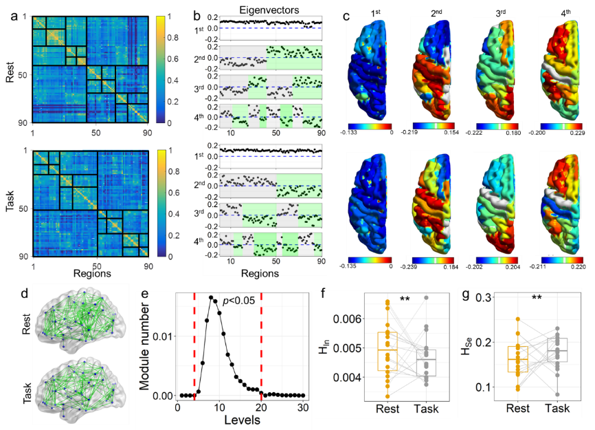 本课题,设计了一个多源干扰任务(MSIT),并引入了嵌套光谱分割(NSP)方法来检测大脑功能网络中的层次模块。通过定义跨多个层次的分层分离和集成,我们表明MSIT要求整个大脑和大多数功能系统具有更高的网络分离,但在控制系统中产生更高的集成度。同时,在任务状态下,大脑网络在分离和整合配置之间有更灵活的转换。关键的是,静息状态下较高的功能灵活性和任务状态下较低的灵活性与更好的任务绩效相关,研究表明将大脑从休息状态切换到任务状态有助于更好地完成任务。我们基于FC网络中分层模块化分析在检测功能组织和人类行为表型的改变方面比基于图形的网络测量在单个水平上更有效。