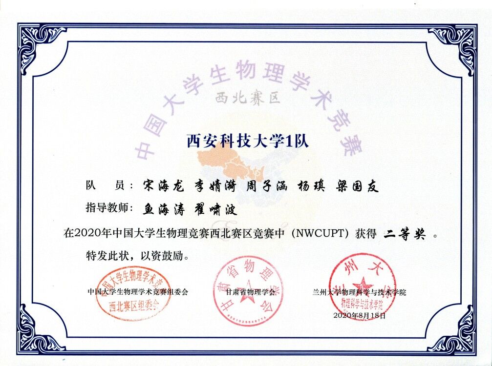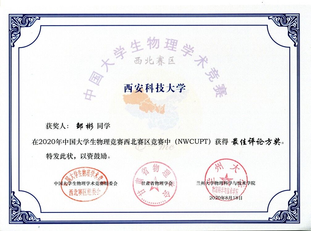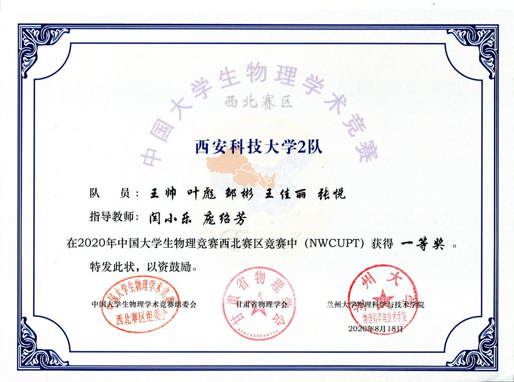 2020年中国老员工物理学术竞赛(CUPT)西北赛区近日成功举办。公司派出来自全校不同专业的十名同学(宋海龙、李婧漪、周子涵、杨瑱、梁国友、王帅、叶彪、邹彬、王佳丽、张悦)组成2支代表队参赛,威廉体育官方网站物理系的闫小乐、庞绍芳、鱼海涛、翟啸波四名教师作为指导教师和裁判参加了本次比赛。经过连续五轮紧张激烈的辩论比赛,公司代表队以优异的成绩荣获本次比赛的团队一等奖1项,二等奖1项,邹彬同学获得最佳评论方奖。
