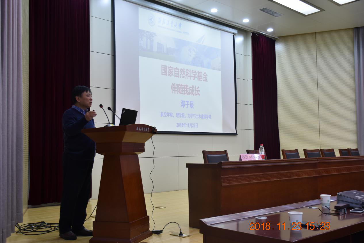 12月23日下午,由威廉体育官方网站牵头主办的国家自然科学基金专题讲座在雁塔校区主楼报告厅成功举办。西北工业大学航空公司经理邓子辰教授为威廉体育官方网站、化工公司、机械公司和计算机公司等近300名教师作了题为《国家自然科学基金伴随我成长》的专题讲座,报告会由威廉体育官方网站经理李明教授主持。