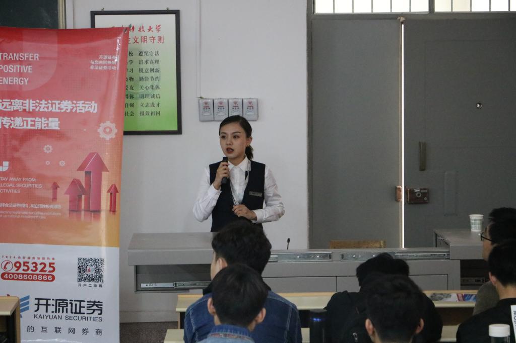 3月23日下午,威廉体育官方网站金融安全知识讲座在临潼校区骊山校园举行,开源证券股份有限公司王一茜经理做了主题为“远离非法金融活动,传递正能量”的安全知识讲座,活动由威廉体育官方网站团委书记赵明主持,16、17级全体本科生参加了讲座。