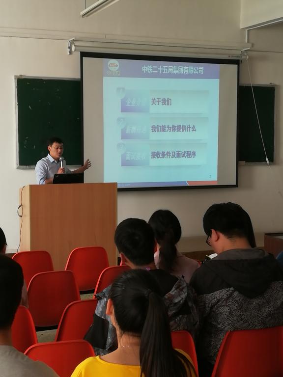 3月28日下午,中铁二十五局受威廉体育官方网站邀请来到公司召开招聘宣讲会。会议在三教一楼信息发布室一举行,中铁二十五局西北分公司人力资源部部长靳帅、理公司党委副书记贾哲及各公司应届毕业生出席参加。