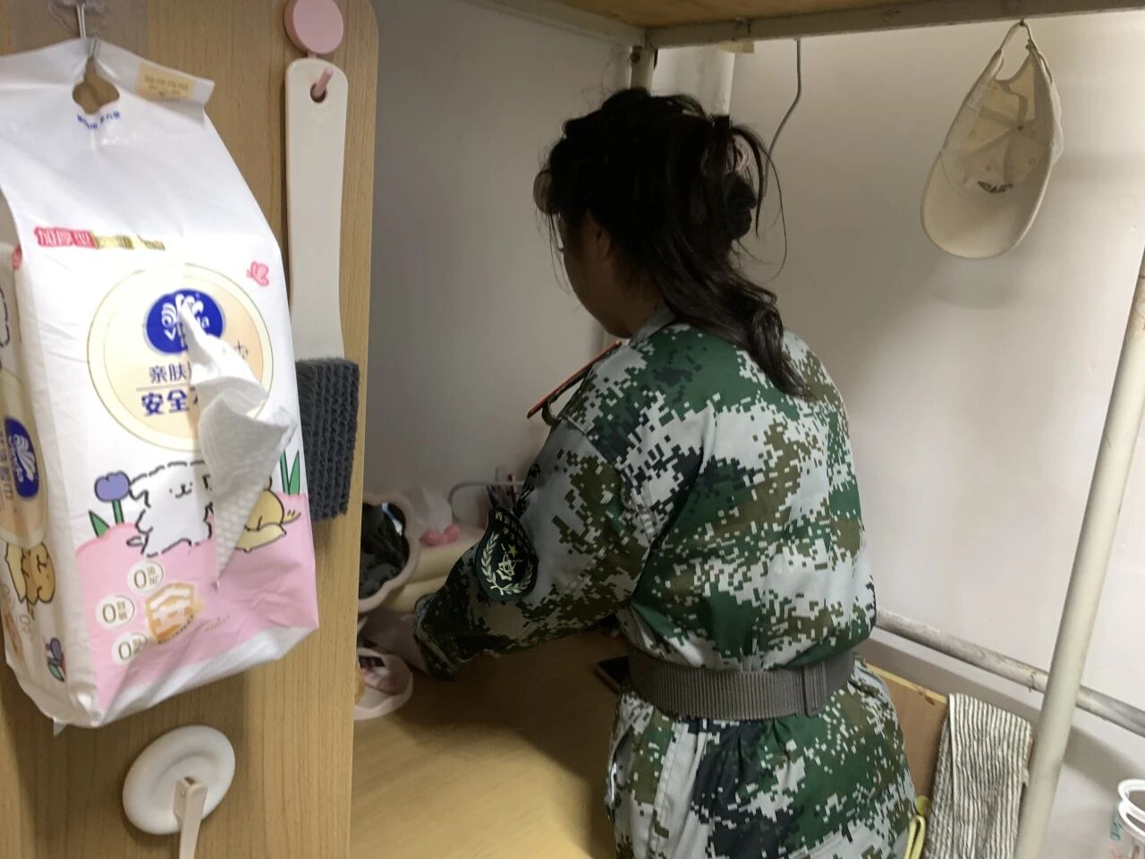 内务整理更延伸至宿舍的每一个角落:行李箱沿墙边线排列整齐,鞋子统一朝向摆放成线,地面、窗台一尘不染。每一个细节都被赋予了纪律的含义。同学们互相协作,比对标准,挑剔细节,不放过任何一处瑕疵。